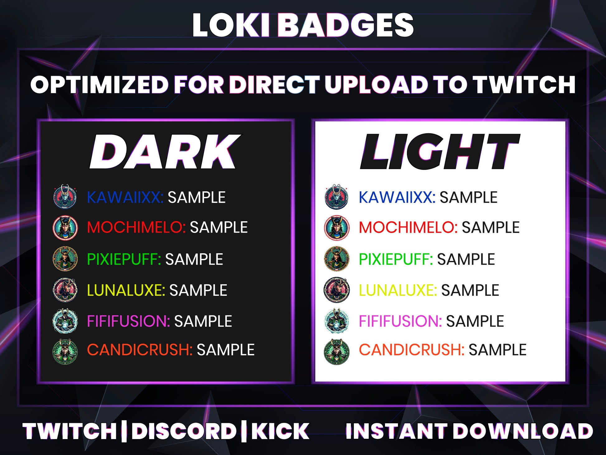 Reward your loyal subscribers on Twitch, Discord, Kick, or YouTube with this evolving badge pack that reflects Loki’s transformation and chaotic energy.
