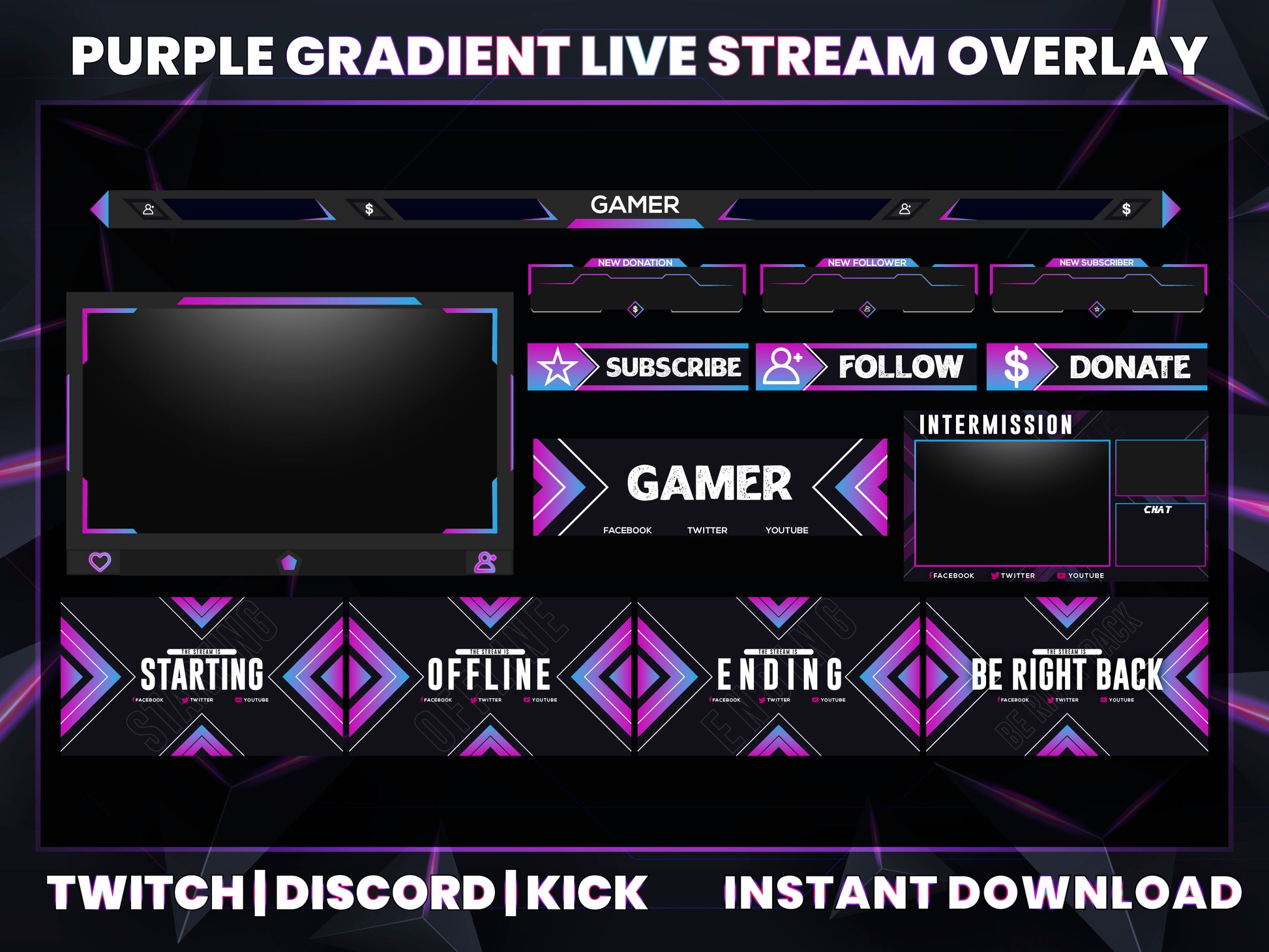 Purple Gradient Live Stream Overlay | Modern Twitch, YouTube & Gaming Stream Package